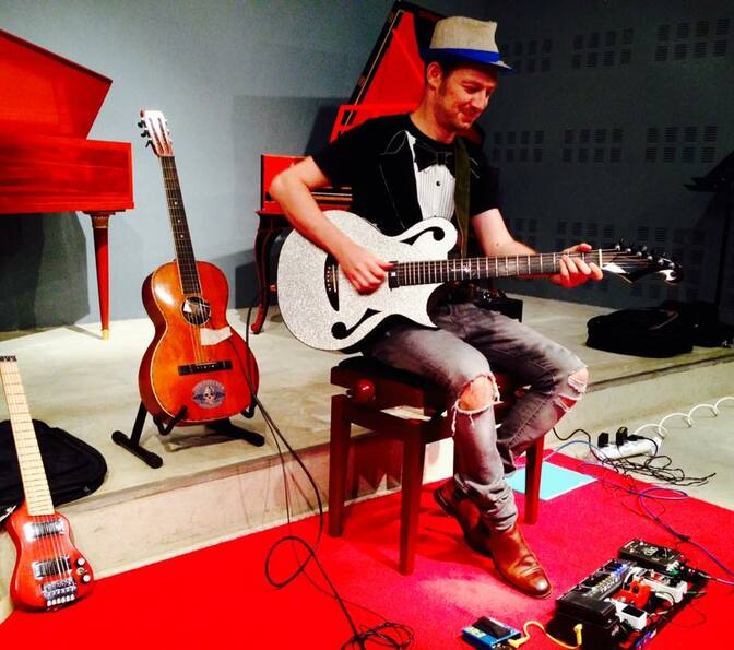 (Mathieu Insa en action avec ses guitares à la Philarmonie, droit réservé)