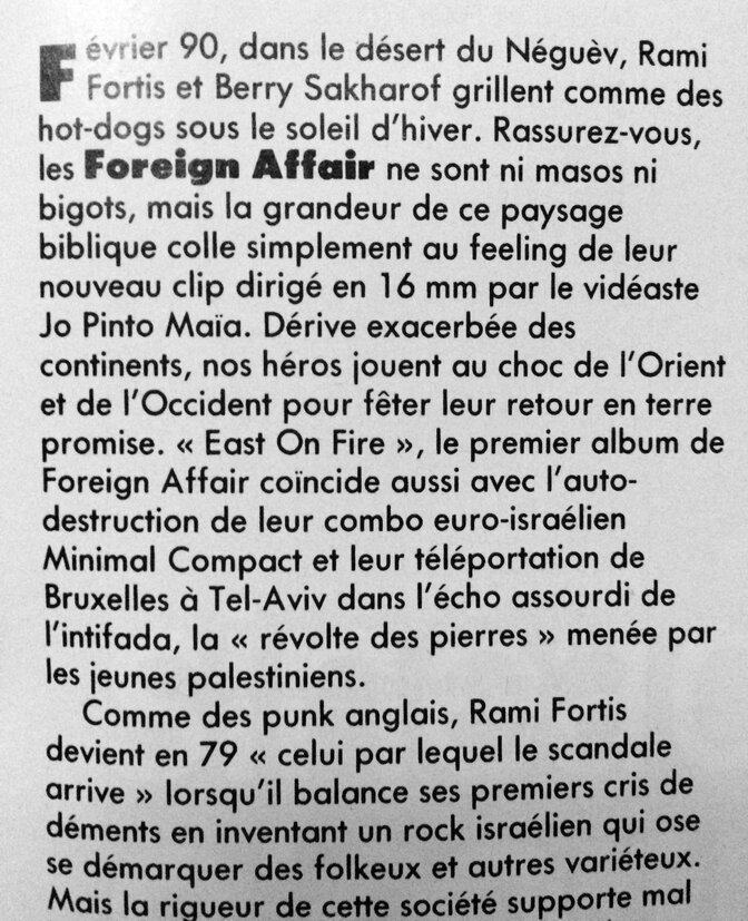 Oui, avec ma petite K7 VHS et mon unique clip, je commence les démarches. Les Transmusicales de Rennes pour ça sont l’idéal car, en backstage il y a foule, non seulement les groupes mais également les chefs de produits des labels, des majors parisiennes… Barclay, Virgin ,BMG, etc. Je rencontre le groupe Foreign Affair, groupe israélien, anciennement Minimal Compact, avec Rami Fortis, et Berry Sakaroff, et un mois après cette rencontre aux Trans, je me retrouve à Tel Aviv pour tourner leur clip…