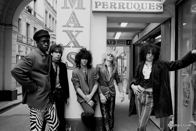 Ce look est arrivé dès 1983. Forte influence New York Dolls, il y avait des groupes qui cartonnaient dans ce style. J’ai commencé à écouter de la musique en 1972 grâce à mes cousins qui était plus âgés que moi : Alice Cooper, T Rex, Slade ! Le glitter quoi … Nous sommes allés chercher quelques fringues aux puces de Saint-Ouen. Sylvain a été acheté ses « plateforme boots » comme à l’époque 70s. On a pris des vestes en serpent … Le look glam de l’époque plus personne ne voulait s’habiller comme çà. Les fringues étaient pas chers sans compter les coiffures qui ont pris plus de temps à se développer (rires) !