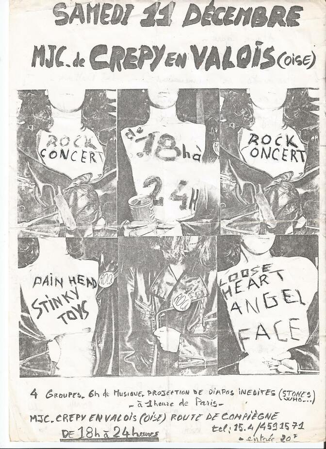 C’était l’année de la découverte. On s’intéressait aussi aux arts plastiques. Les gens avec qui je passais du temps étaient un peu plus âgé que moi. On était à 120 km de Paris, on pouvait y aller dans la journée. On y allait en train ou en stop. On allait voir des expositions. J’ai pu voir comme ça des rétrospectives de Man Ray, Duchamp, Picabia … On allait au cinéma voir des films de Philippe Garrel pour essayer de voir Nico. On allait voir des films expérimentaux de Henri Michaux ou de Jodorowsky. Et Grâce à la boutique Harry Cover dans les Halles qui faisait un fanzine / magazine « Rock News ». Ça nous a permis de savoir ce qui se passait à Londres, New York et Paris. C’étaient les débuts du Punk Rock On s’intéressait aux avant-gardes qu’il y avait eu en France & en Europe comme Dada, les surréalistes et les situationnistes. Tout ça constituait un socle commun. Il y avait aussi en 1976, Alain Pacadis qui faisait White Flash, une rubrique dans Libération. Il avait annoncé un concert Punk rock en Déc 76 en banlieue parisienne, un peu comme un mini festival avec les Stinky Toys, Angel Face, Loose heart, Pain Head On y est allé. ce fut comme un accélérateur, toute cette énergie !!!
