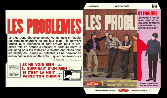 Pop Supérette réédite le premier EP (Vogue, EPL 8393) des Problèmes, sorti en novembre 1965, en édition vinyle limitée (300 copies) à l’identique (pochette avec rabats extérieurs etc.), OBI, carte postale et insert 2 pages.