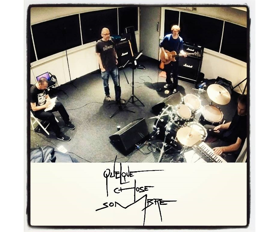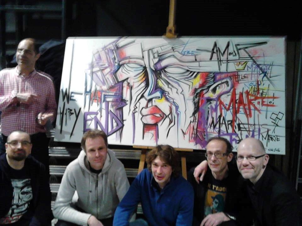 En fait, j’avais précédemment travaillé avec un groupe qui s’appelle Clouzot, donc j’étais leur parolier, et de ce fait un peu dans le groupe par procuration. C’était assez grisant de ne pas faire l’acteur, mais d’être juste spectateur, et de les voir au cœur du processus de création, c’était plaisant et j’ai toujours secrètement rêvé d’être dans un groupe de rock, même si je n’en ai pas l’envergure ni le talent. Maintenant, le rock, ça a toujours été quelque chose de fascinant. Je cherchais le support et en fait, Mike, qui est donc le graphiste du groupe, était depuis un certain temps dans diverses formations où il mettait sur toile ce qui passait du point de vue du son. Par exemple, il était avec un batteur, uniquement un batteur, et en fonction de ce qu’il produisait, lui il peignait. Et je me suis donc dit que ce serait bien de faire quelque chose d’à la fois rock tout en intégrant Mike. À la base, j’avais envie de faire tout ton texte, du moins en grande partie, et puis, il y a eu quelque chose qui ne fonctionnait pas, je ne saurais pas dire quoi, certainement le thème, car c’est tout de même un texte difficile, très dense.